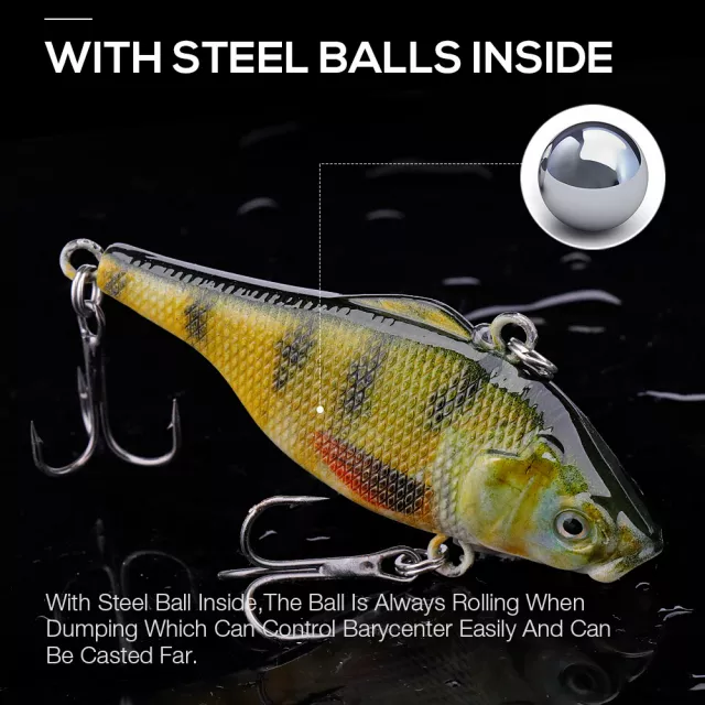 These vibration lures are crafted from durable ABS plastic and carefully balanced for consistent swimming action. Every lure is hand-tuned and water-tested to ensure it performs perfectly right out of the box. Strong split rings and sharp treble hooks provide reliable hooksets and reduce lost fish during the fight.